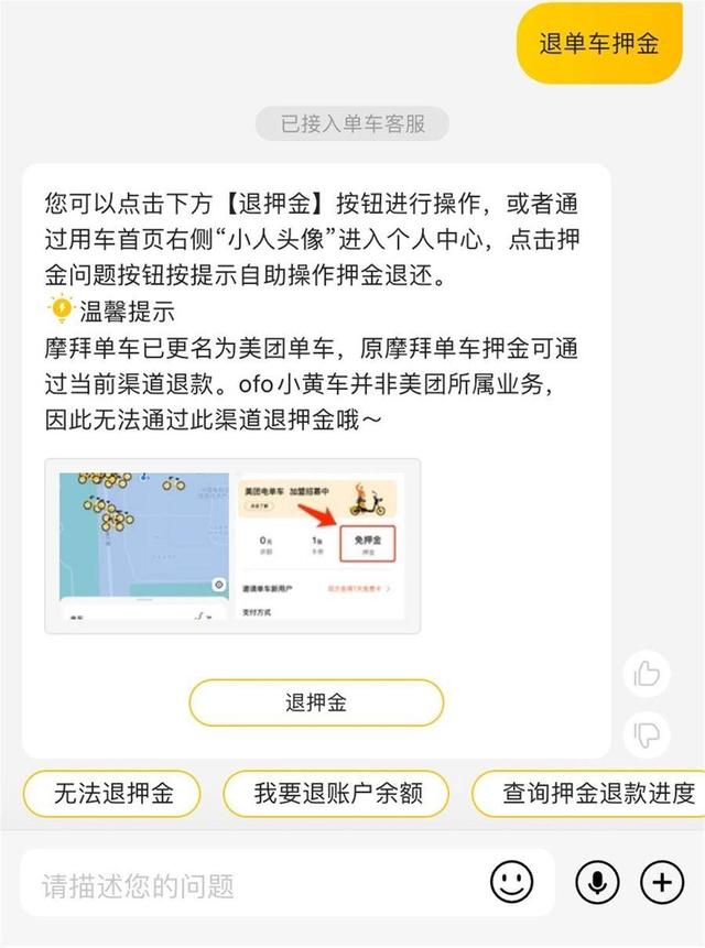 记者尝试后发现,网友所称方式确实可行。同时,美团客服还提醒“ofo小黄车并非美团所属业务,因为无法通过此渠道退押金”。不过,美团单车相关工作人员对媒体表示,摩拜单车2018年就可以退押金了,系旧闻,现在也是免押服务。