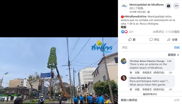 米拉弗洛雷斯市政厅脸书直播。公开检索关键词“antena Miraflores Roca y Bologna”(天线 米拉弗洛雷斯 罗卡和博洛尼亚),可以找到米拉弗洛雷斯市政厅于当日发布的消息稿件。文章称,这根30米高的无线电传输杆由一家名为Coar North SAC的运营公司于黎明时分偷偷安装,而此举未经官方授权,也未得到当地居民的同意。在经过两个月的调查后,市政厅终于采取强制措施将其拆除。市政厅发言人雨果·泽瓦洛斯(Hugo Zevallos)表示:“这根无线电传输杆的安装是非法和随意的,这激起了居民们的抗议……这家公司违反了基本原则……安装了巨大的无线电传输设备。”泽瓦洛斯称,市政当局已经两次对Coar North SAC公司进行罚款,金额共计超过8000新索尔(折合人民币约13843.38元)。