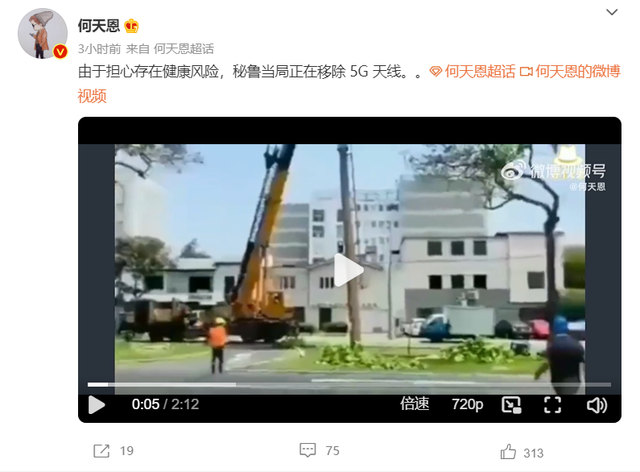 8月12日,微博上传出一种说法称,“由于担心存在健康风险,秘鲁当局正在移除5G天线。”网友放出一则长2分12秒的视频,视频中,工人操作一辆黄色吊车,拆除了一根伪装成绿植的杆子,引得群众围观。
