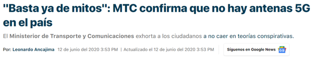 米拉弗洛雷斯市政厅官网消息。该报道全篇未提及5G相关字眼,只称其为“无线电传输设备”。经查证,网传视频拍摄时,秘鲁国内尚未有5G部署。2020年6月12日,秘鲁运输和通信部在YouTube上进行了一场名为“关于天线,你需要知道的一切”的线上直播讲话。通信控制和制裁局局长帕特丽夏·迪亚兹(Paricia Díaz)指出,秘鲁国内尚没有5G天线,并驳斥了将5G同新冠以及新冠疫苗联系起来的阴谋论。“关于电信天线会导致癌症或疾病的神话已经够多了……没有科学研究以任何方式支持天线与癌症、新冠或任何其他疾病有任何关系,”迪亚兹说。