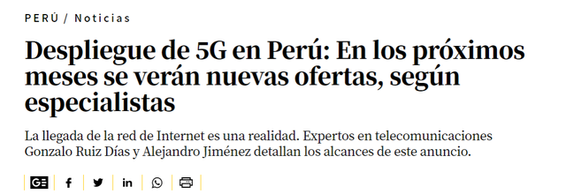 RPP Noticias关于5G报道标题截图。据《秘鲁商报》(El Comercio Peru)报道,2021年3月1日,秘鲁运输和通信部批准墨西哥电信运营商Claro和智利电信运营商Entel在3.5 GHz频段的固定无线互联网上实施 5G 技术服务。