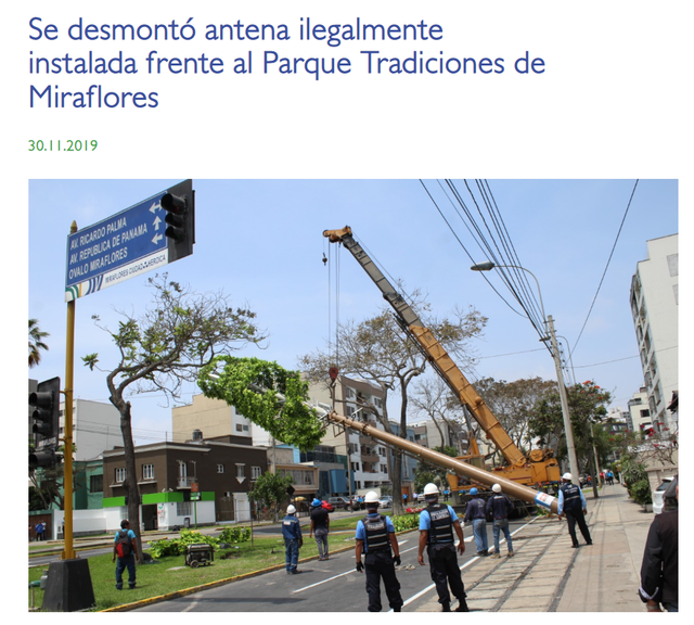 2019年11月30日,秘鲁利马省米拉弗洛雷斯(Miraflores)市政厅在脸书主页上对这场电线拆除活动进行了十余分钟的直播。视频描述写道,米拉弗洛雷斯市政当局拆除了未经授权的无线电传输杆,并表示施工地点位于“罗卡和博洛尼亚大街”(Av. Roca y Bologna)。