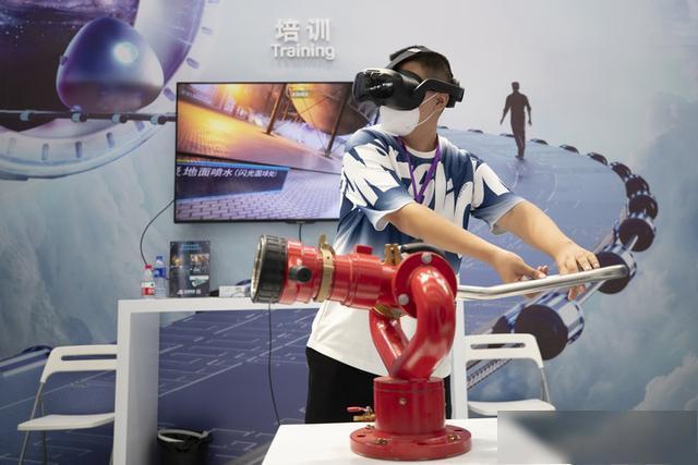 8月11日,在2022世界5G大会展厅里展示的5G网络支持下的5G+VR灭火培训平台。新华社记者张涛摄