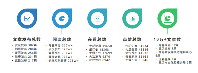 从单项指数看,阅读总数、在看总数、平均阅读数、平均在看数等指数几乎实现普涨。比如阅读总数,22个账号较上期有较大幅度增长,其中,“健康湖北”增量超94W+,位列首位;20个账号阅读总数增量超10W+。平均阅读数,有23个账号平均阅读数增量为正。10W+文章方面,本期共有65篇,较上期增长13篇。“青春湖北”是10W+文章生产大户,共产出32篇。