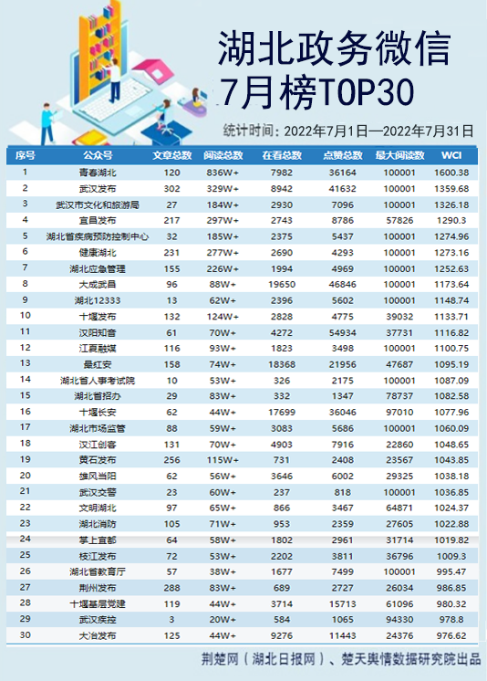 湖北政务微信7月TOP30榜:超七成账号WCI指数上涨