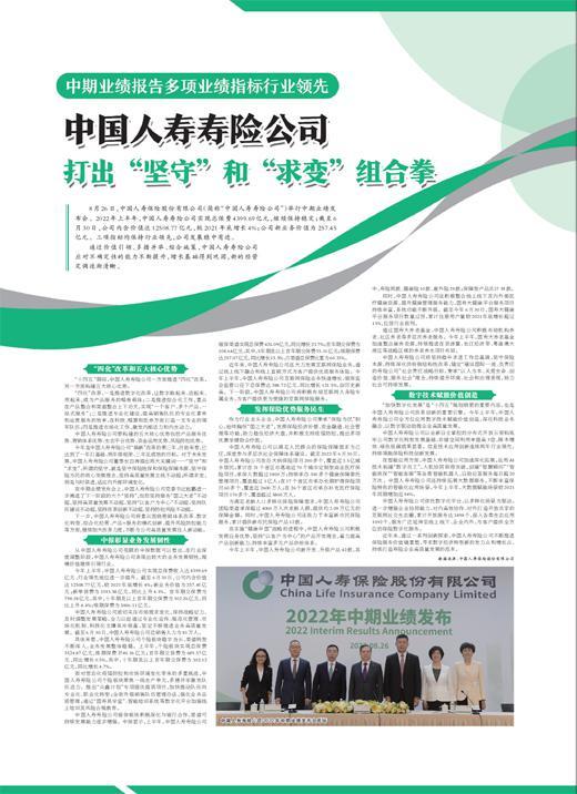 8月26日,中国人寿保险股份有限公司(简称“中国人寿寿险公司”)举行中期业绩发布会。2022年上半年,中国人寿寿险公司实现总保费4399.69亿元,继续保持稳定;截至6月30日,公司内含价值达12508.77亿元,较2021年底增长4%;公司新业务价值为257.45亿元。三项指标均保持行业领先,公司发展稳中有进。