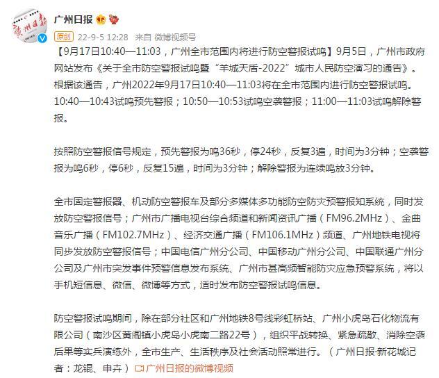 9月5日,广州市政府网站发布《关于全市防空警报试鸣暨“羊城天盾-2022”城市人民防空演习的通告》。根据该通告,广州2022年9月17日10:40—11:03将在全市范围内进行防空警报试鸣。10:40—10:43试鸣预先警报;10:50—10:53试鸣空袭警报;11:00—11:03试鸣解除警报。