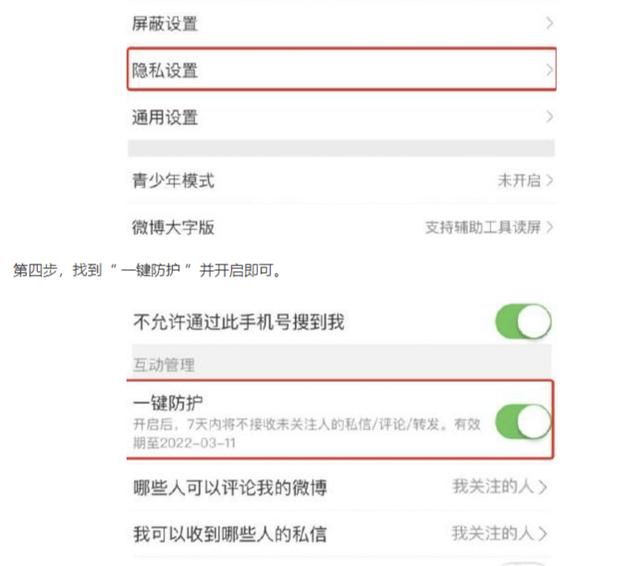 1月27日,微博官方账号“微博管理员”发布公告,称将上线“一键防护”功能,开启这一功能的博主7天内不再接收未关注人私信,他人无法评论其微博,转发纪录也不再在本人主页显示。