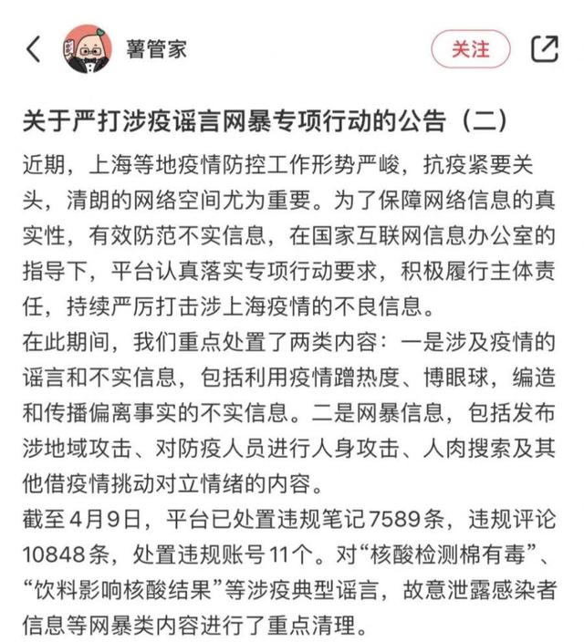 4月,针对疫情期间编造谣言、网暴他人、地域攻击等不当行为,小红书处置违规笔记2151条,评论8928条。