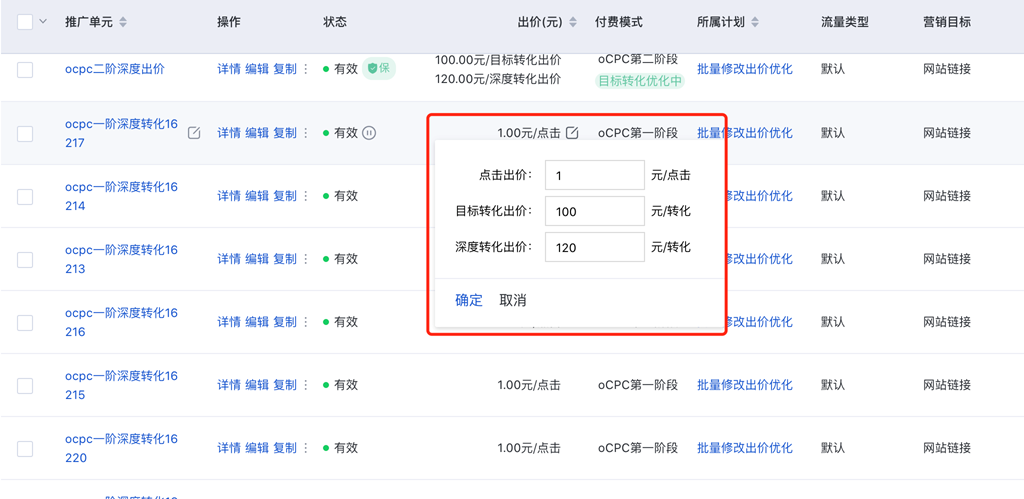 (2)操作流程:出价指标列-点击编辑icon-设置点击出价、目标转化出价或深度转化出价价格-点击确定,完成修改