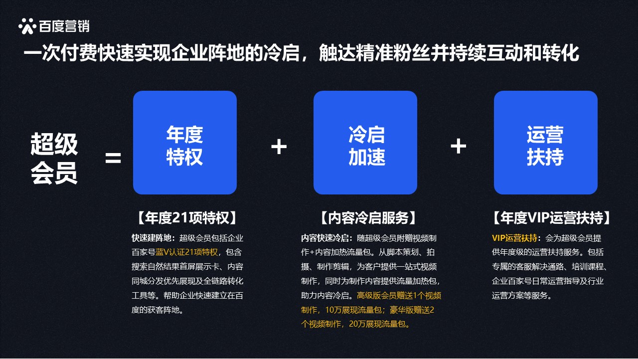 【百度企业超级会员尊享权益】=【年度21项特权】+【内容冷启服务】+【年度VIP运营扶持】