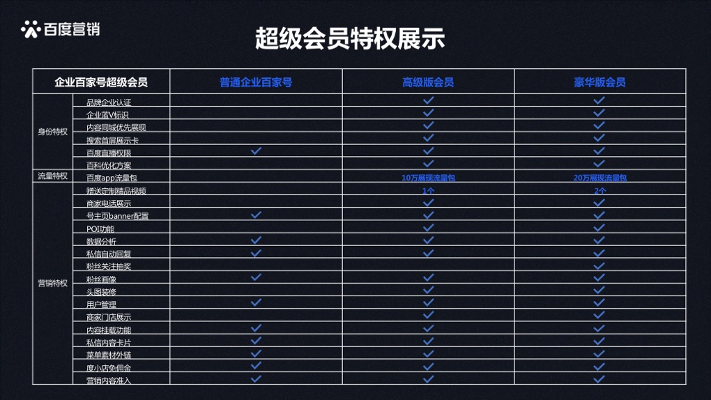 『企业百家号』是百度专为企业打造的,集品牌内容生产发布、用户运营沟通、销售转化为一体的私域运营阵地。为助力企业达成快速冷启和长效运营,特发布【百度企业超级会员】产品,涵盖企业百家号的21项功能权益、视频定制生产、内容加热流量包、运营扶持等权益及服务,分高级版与豪华版两个档位,帮助商家实现全域全链营销增长。