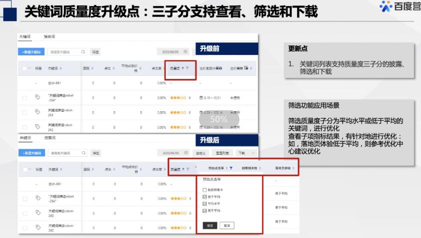 - 管理更便捷:支持在关键词列表自定义列中添加预估点击率、创意相关性、落地页体验三因素,支持自定义调整顺序,提升管理效率;