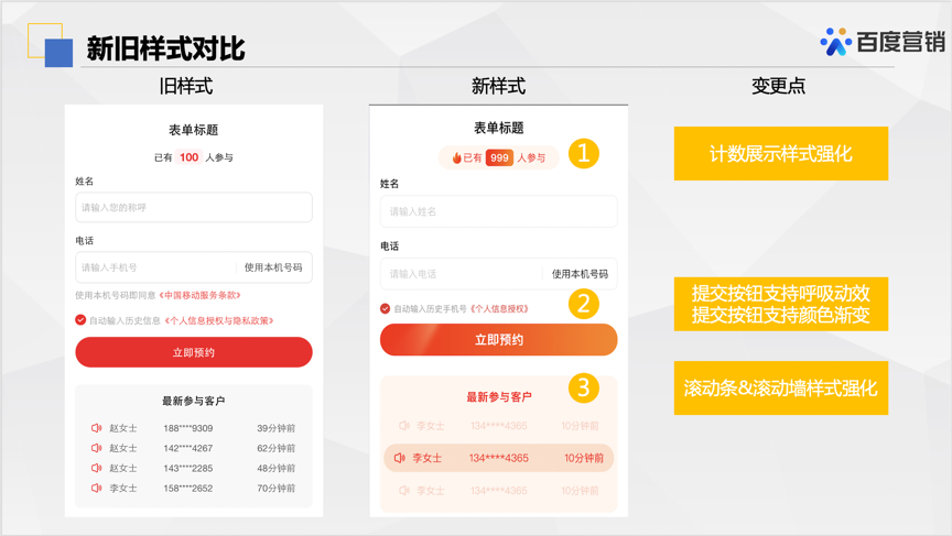 为满足客户对表单标题&按钮的强样式需求,提升网民留资意向,现更新表单在百度APP外(如浏览器、微信)浏览时按钮、标题、滚动墙的展现样式。