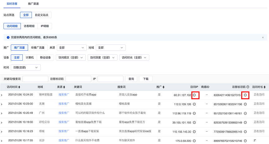 使用操作:屏蔽ip及访客功能入口:站点分析-数据看版-实时访客。鼠标悬浮到要屏蔽的【访问ip】或者【访客标识码 】后面的小图标上