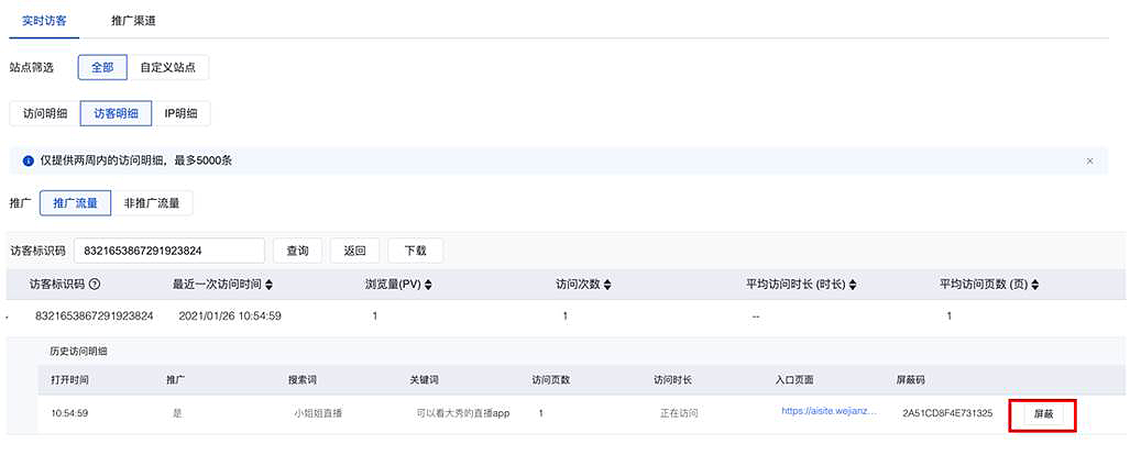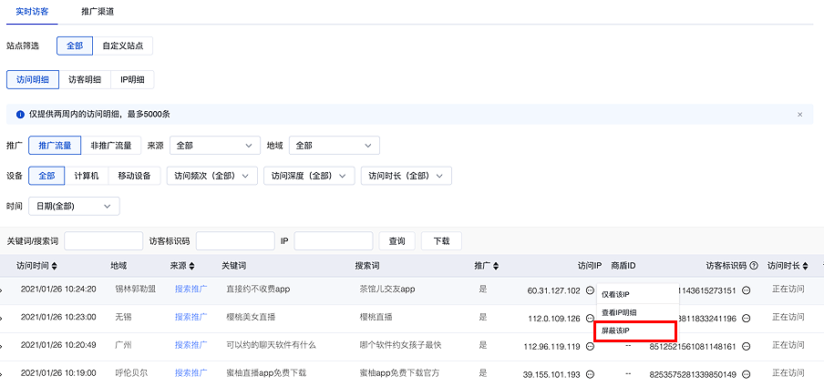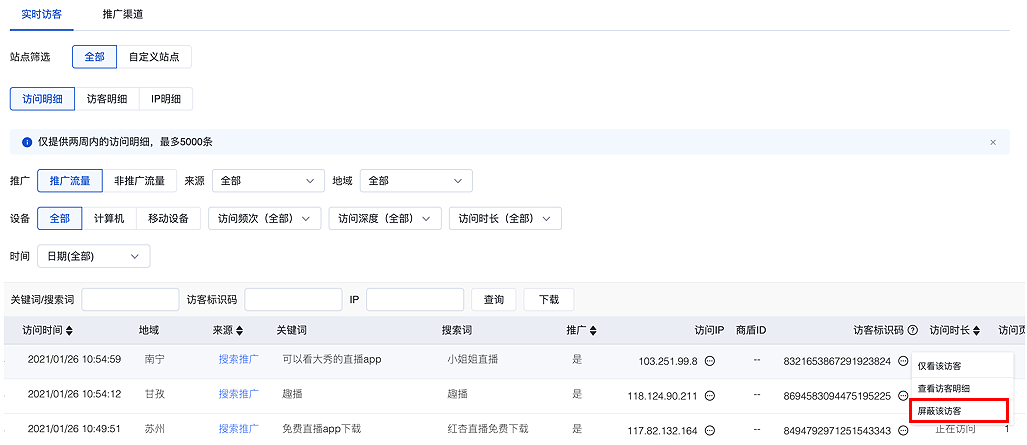 2.数据看板-实时访客:支持客户在报告中直接屏蔽流量