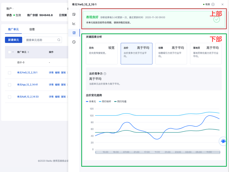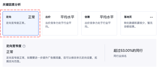 2.1诊断面板分区说明:诊断面板分为上下两部分。上部展现当前单元整体诊断结果,快速呈现单元概要诊断信息;下部展现当前单元的关键因素分析,常驻4类诊断摘要卡片,分别是定向、出价、创意、落地页,披露该物料层级的数据变化趋势: