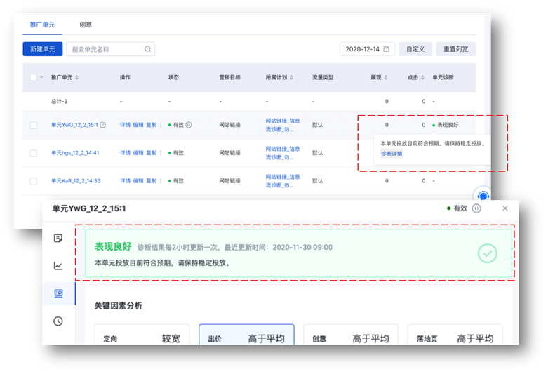 上述结果指标可在物料列表-推广单元-【单元诊断】指标中查看(如下图,点击【诊断详情】可唤起诊断面板),也可以在诊断面板的上部结果区查看。