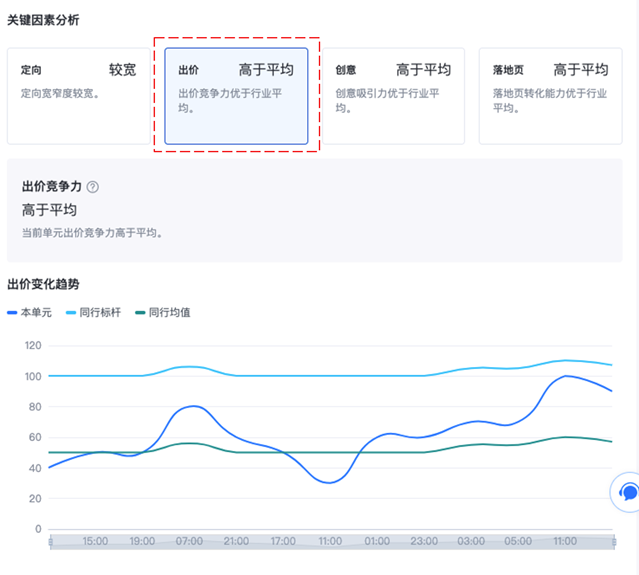 出价:提供出价分析与结论,披露出价竞争力,支持同行标杆、同行均值对比趋势图- 出价竞争力反映在诊断时间区间内的出价水平,出价竞争力排名越靠前,评级越好,越容易胜出