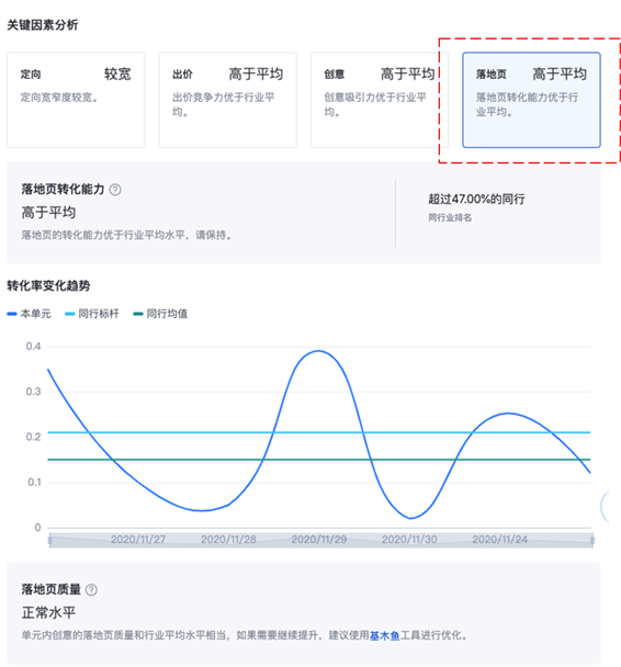 落地页:落地页分析与结论,披露落地页转化获取能力,支持同行标杆、同行均值对比趋势图(落地页获取转化能力是该单元落地页转化效果指标,通过绝对值及同行业排名,定位转化率表现情况;落地页质量是对当前单元所投放的落地页素材质量、用户体验进行综合分析评估的指标,分析结论反映最近该单元的落地页质量在百度系媒体投放时的综合表现)