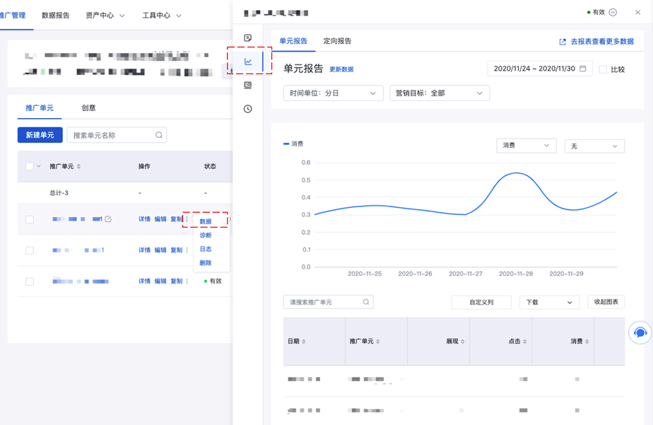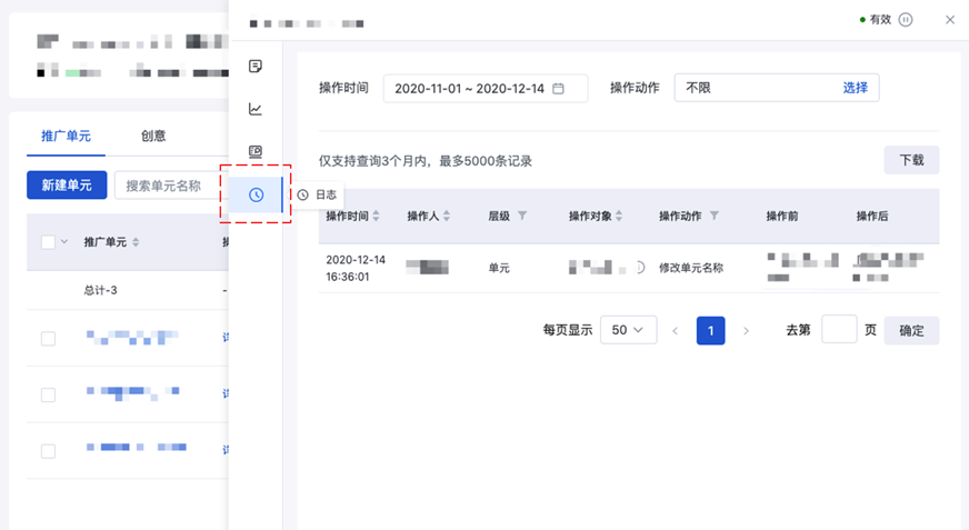 1.产品入口:推广计划/推广单元层级-操作列-详情-日志