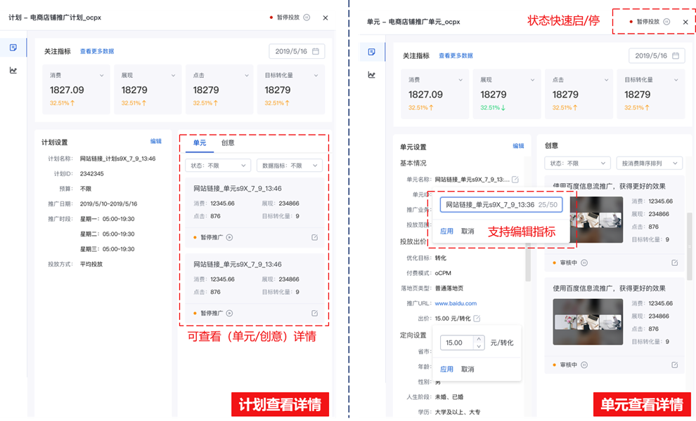 查看详情内设置的计划/单元基础信息,与推广管理物料列表、主流程内进行的操作一致