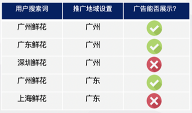 示例:启用「搜索意图地域词排除功能」后,广告主购买“鲜花”关键词,推广地域设置为广州或广东时
