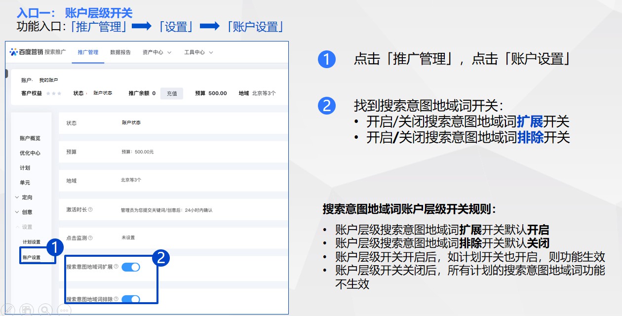 打开「推广管理」,点击「账户设置」,可见”搜索意图地域词”开关
