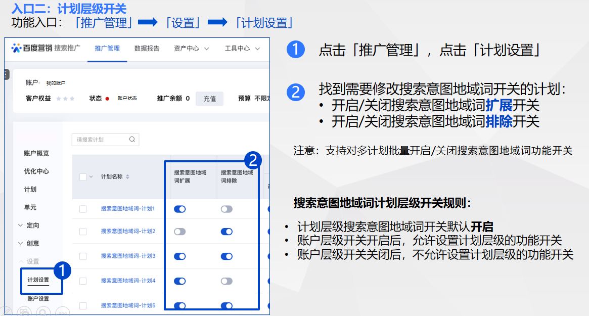 打开「推广管理」,点击「计划设置」,可见计划列表中的“搜索意图地域词”开关