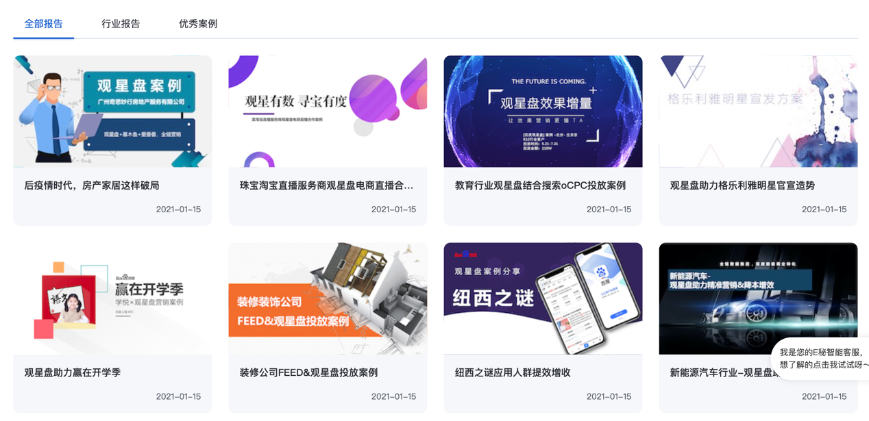 分为行业报告(基于观星盘数据产出行业相关报告)、优秀案例(观星盘优秀营销案例)两大模块,帮客户进行行业深度洞察和成功案例学习。