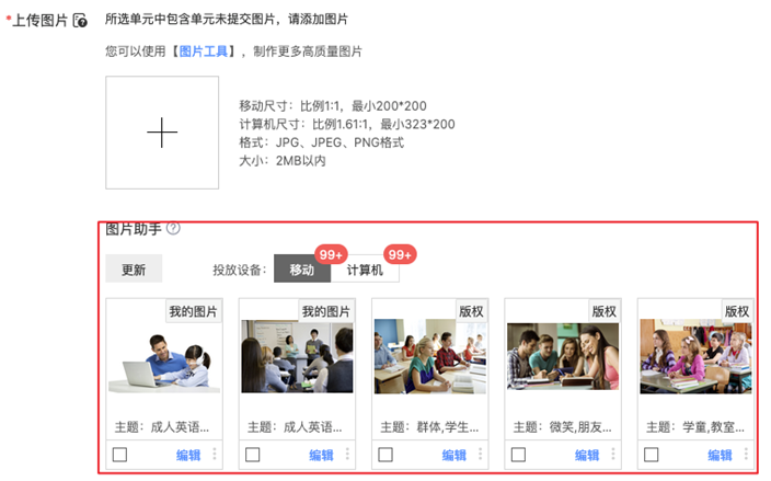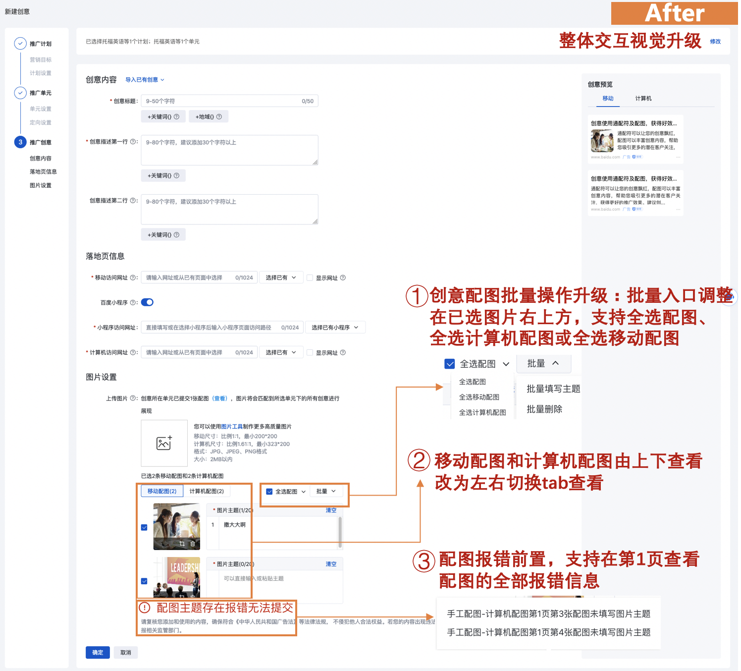 其中,重点升级配图展示与管理、批量操作交互,同时精简功能入口、调整报错信息位置,整体提升客户创意设置的体验,提升客户投放效率。