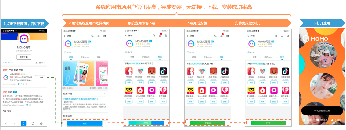 此前安卓系统下,各厂商对第三方来源的应用安装进行了拦截,权限问询、安全提示、厂商应用市场劫持,拉长了下载路径,用户的下载&安装行为容易中断,给用户带来了不好的下载体验,导致部分用户放弃安装,影响广告主下载类广告的转化效果。