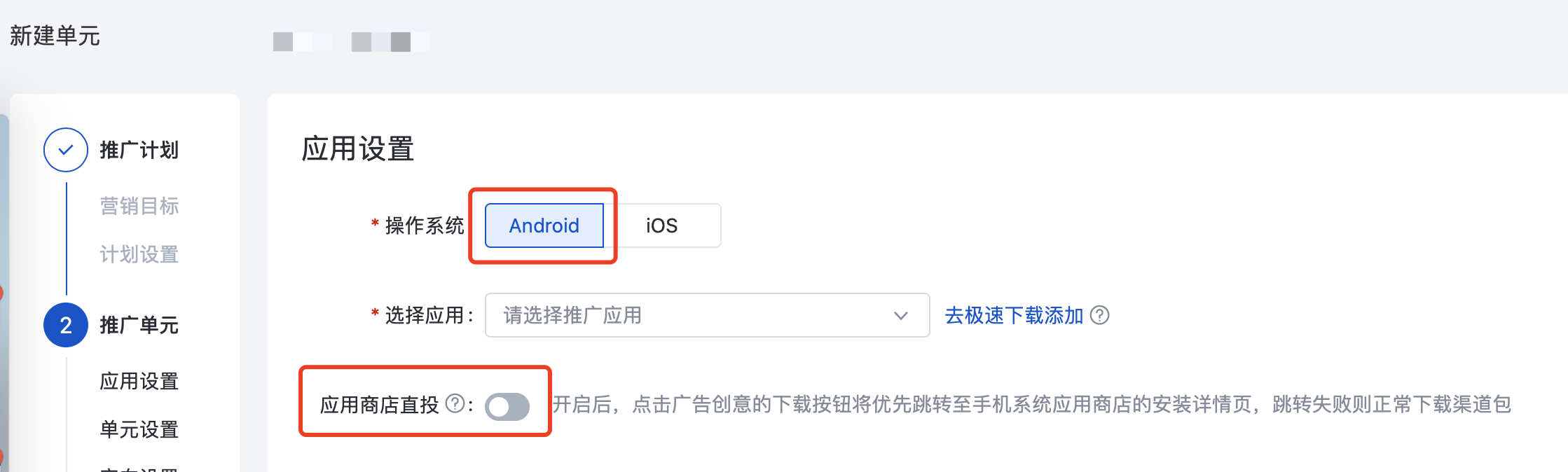 1.【应用推广】营销目标——在新建单元页新增「应用商店直投」开关