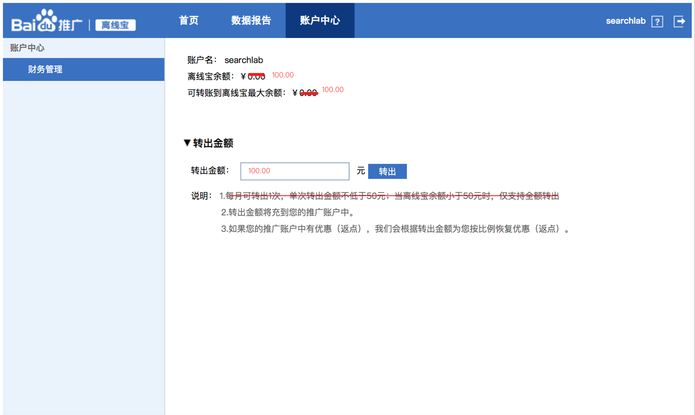 - 下线后未操作的账户会将离线宝内的余额自动返还至该账户的推广余额内