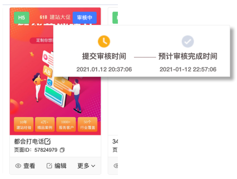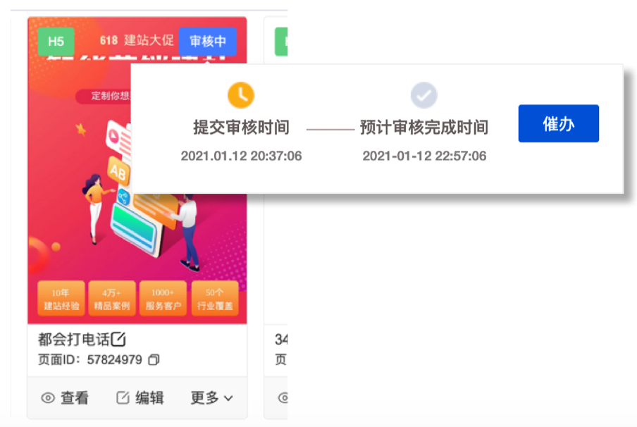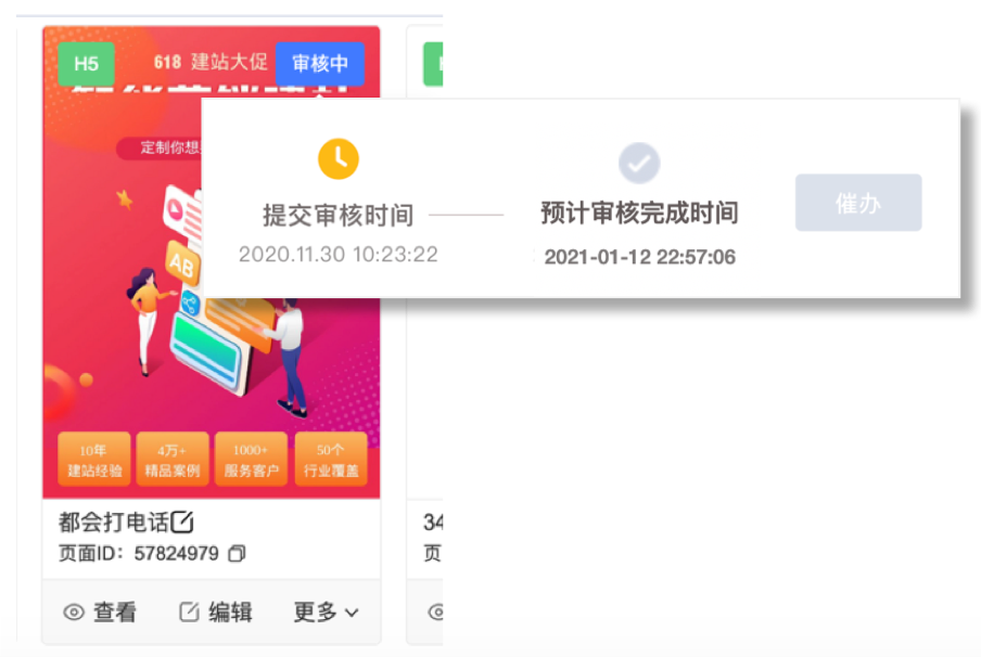 目前站点送审后审核时间不固定,客户及一线不了解审核时长,为提升客户和一线对于审核的感知,特上线明示预计审核完成时间,如到审核时间后,还未审核通过,还可进行催办,以此进一步提升站点制作及后续的投放效率。