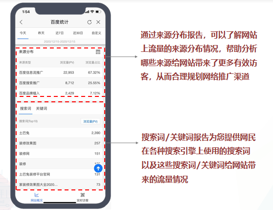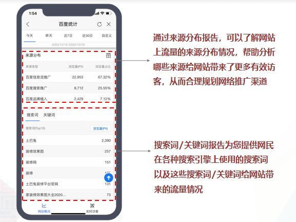 • 网站概括:从推广流量的趋势分析、来源分布、搜索词/关键词、入口页面、转化概括、新老访客、地域分布的纬度,为网站的精细化运营决策提供数据支持,赋能推广客户营销提效;