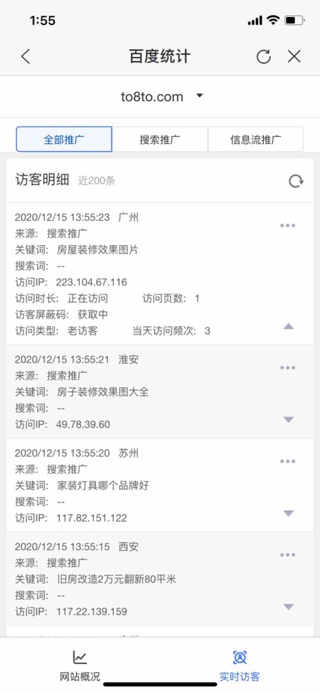 1.3 实时访客报告:实时访客报告提供最新访客的来源、地域、关键词、搜索词、IP等详细信息。帮助了解当前的访客行为,及时根据访客特征优化网站。