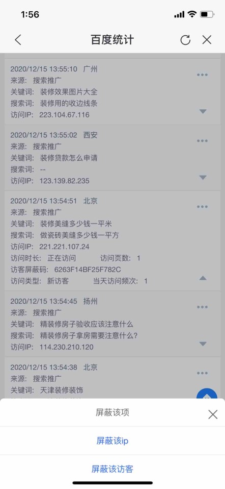 另外,针对搜索推广来源的流量,可提供IP及访客屏蔽的功能,点击右上角的“…”图标,即可进入屏蔽功能入口,选择“屏蔽该IP”或者“屏蔽该访客”,即可进入屏蔽确认页面