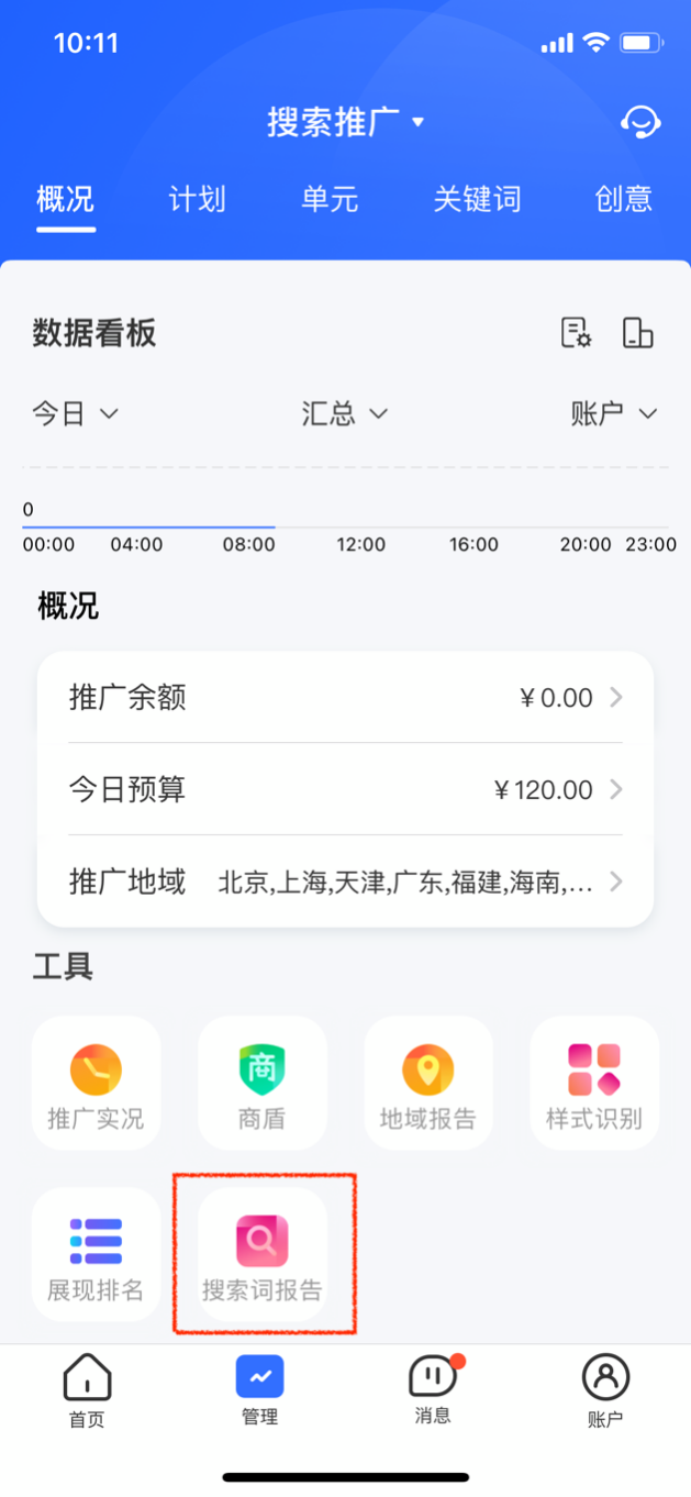 2.1 入口:点击管理-搜索推广-工具,即可进入搜索词报告