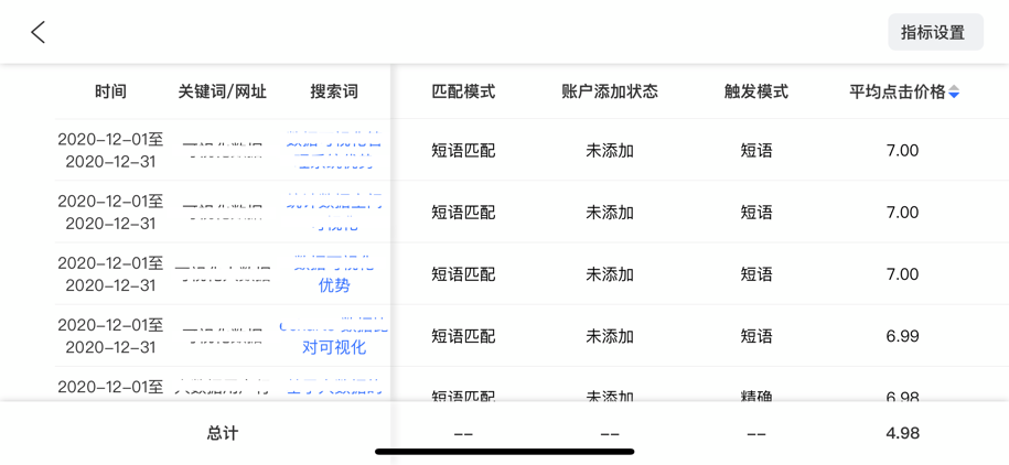 ② 支持横屏查看数据并支持全部转化指标:可以快速对比不同时间/搜索词的数据,支持横屏查看功能,支持点击指标名进行正序&倒序排列,同时可设置关注的指标,最多15个。