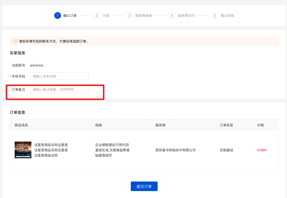 1)确认订单页新增订单备注,支持客户填写对于该订单的特殊信息备注