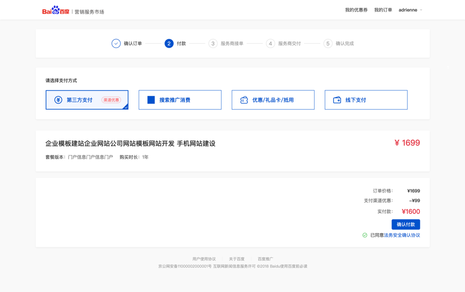 2)针对定制建站和标准模板这两种商品,付款页面新增第三方支付和线下支付两种支付方式,并在右下角展示所有类型的价格。