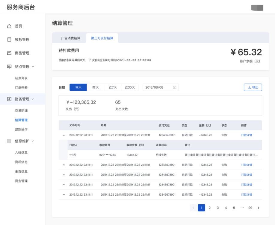 1)结算规则:在订单状态为交易成功或交易关闭时进行核销,打款方式为T+7(即本周一结算上周7天的账单)