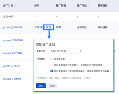 A2:复制推广计划时支持复制该计划下的单元和创意,也可以单独复制计划。