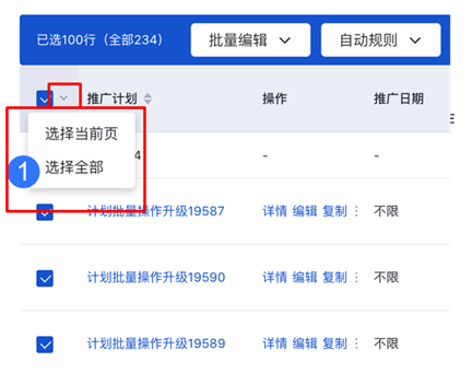 Step1:点击推广计划列表顶部表头复选框旁侧箭头-点击「选择全部」按钮