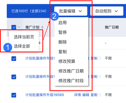 A3:支持批量启用/暂停、删除、复制、修改预算、修改推广时段和修改推广日期。
