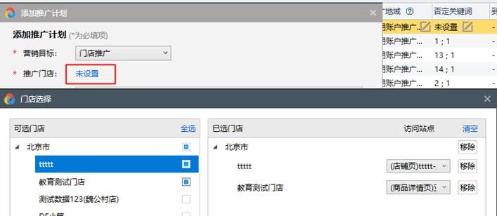 第二步:设置“推广门店”,弹框显示可选门店,选择门店