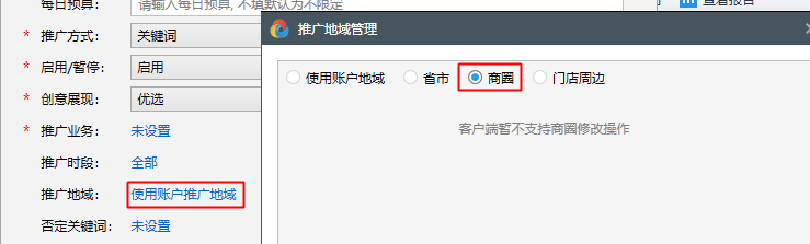 商圈:本期暂不支持编辑,如在web设置商圈定向,在百度营销客户端可以看到已选“商圈”选项,但无法查看明细,如下: