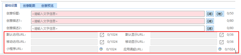 - 创意层级:无需填写默认访问url、默认显示url、移动访问url、移动显示url、小程序url、应用调起url