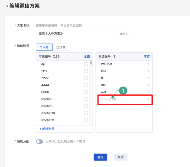 4)微信方案查看入口:营销通-粉丝关注-微信-新建/编辑微信方案,查看或者编辑方案时,暂停的微信号后会显示“(已暂停)”